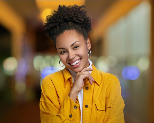 Studio shot of charming pleased young woman with curly combed po